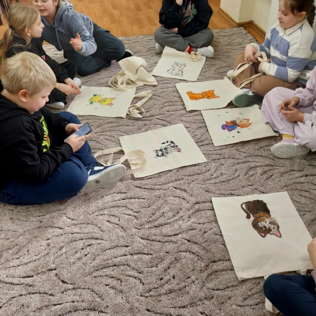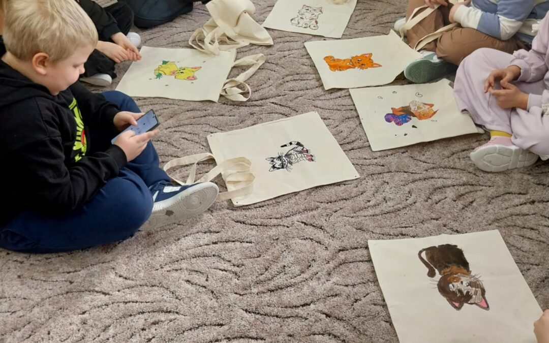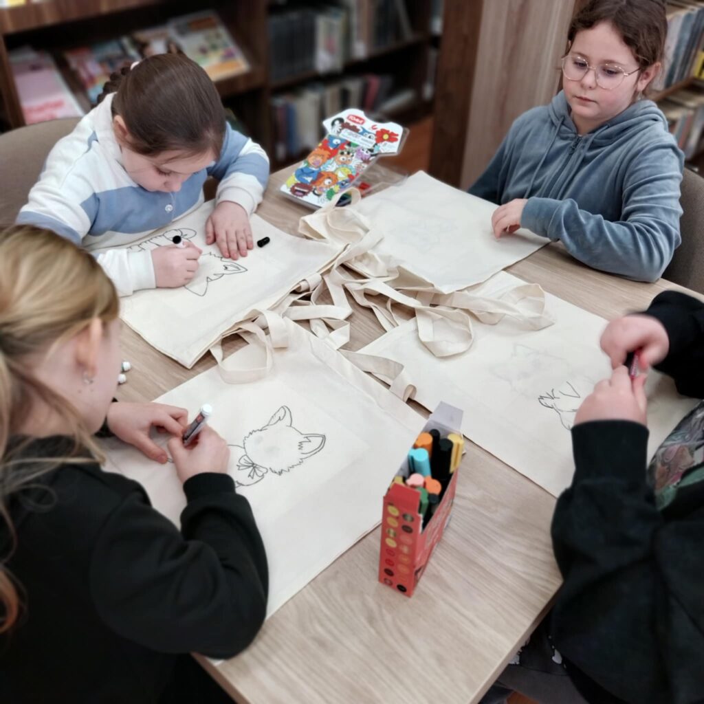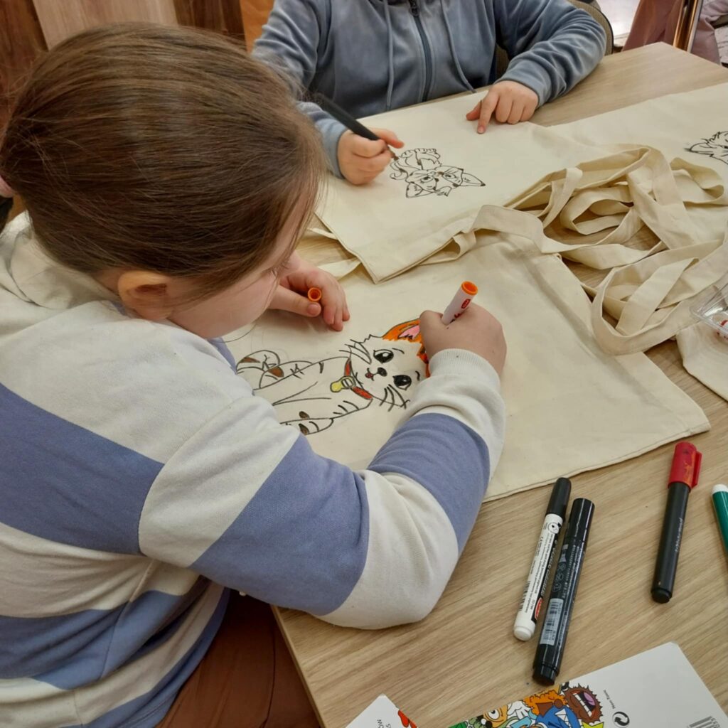 Po części literackiej przyszedł czas na twórczą zabawę. Dzieci wzięły udział w warsztatach plastycznych, podczas których malowały bawełniane torby ozdabiając je wybranymi przez siebie motywami kotów. Każda torba była inna — kolorowa, pomysłowa i odzwierciedlająca indywidualną kreatywność małych artystów. Zajęcia pozwoliły połączyć literaturę z działaniem artystycznym, co stworzyło atmosferę radości i swobodnej twórczości.