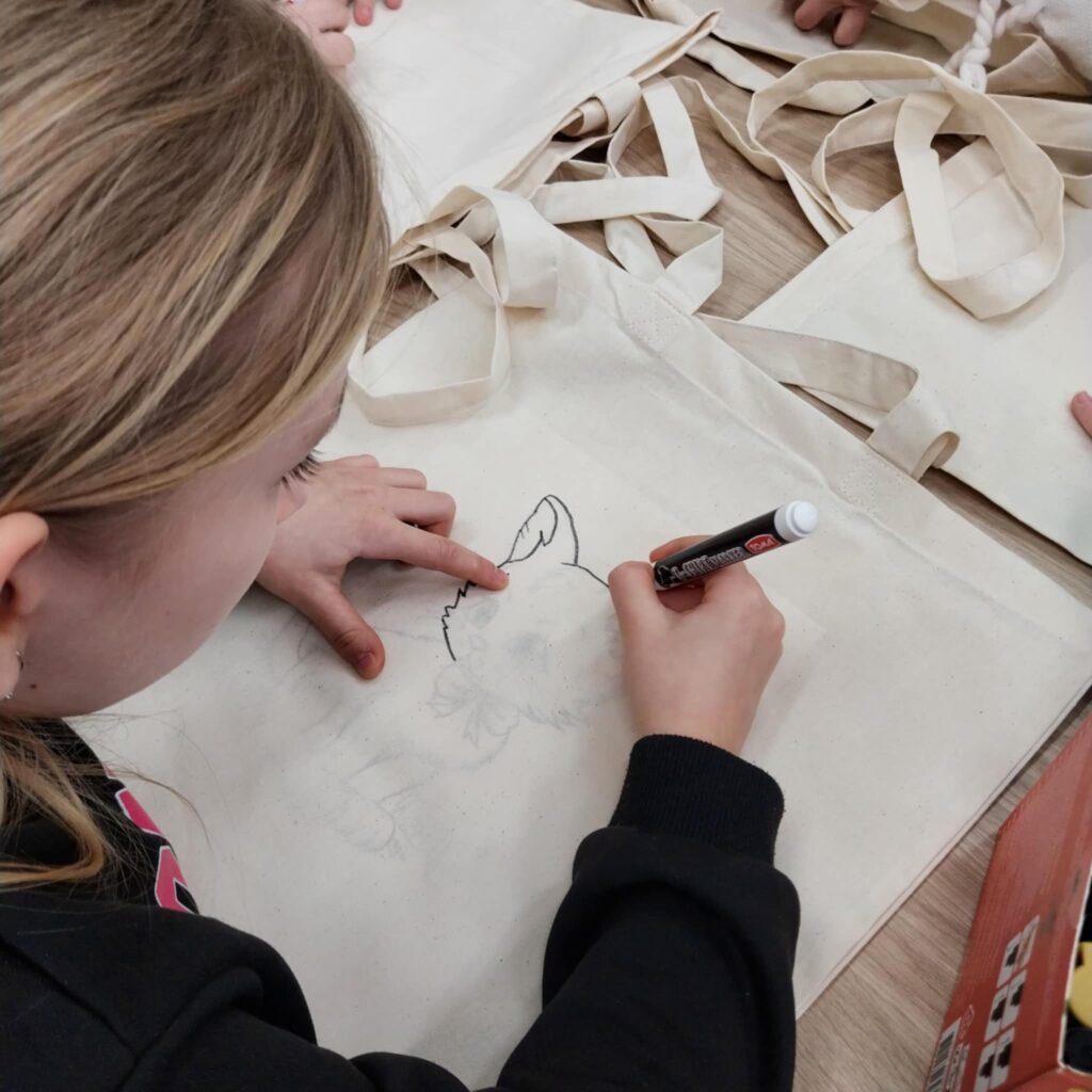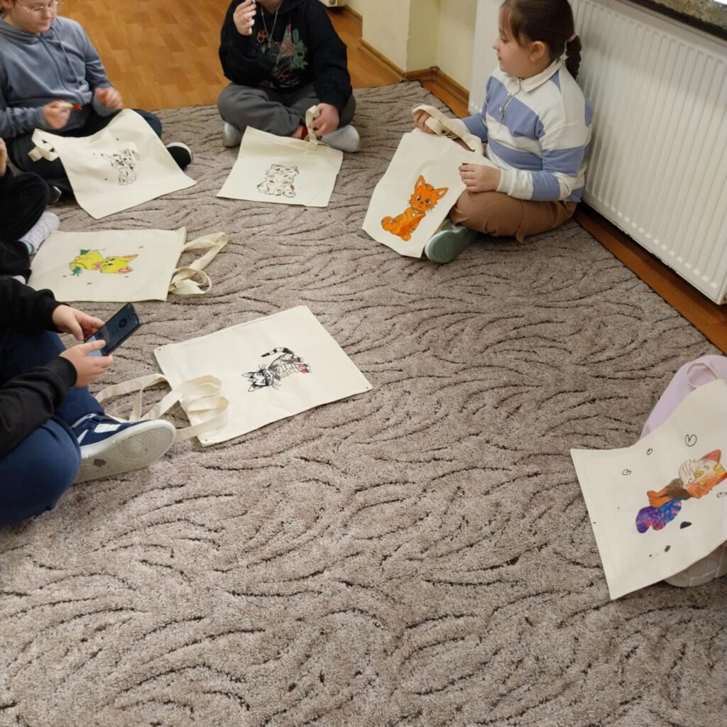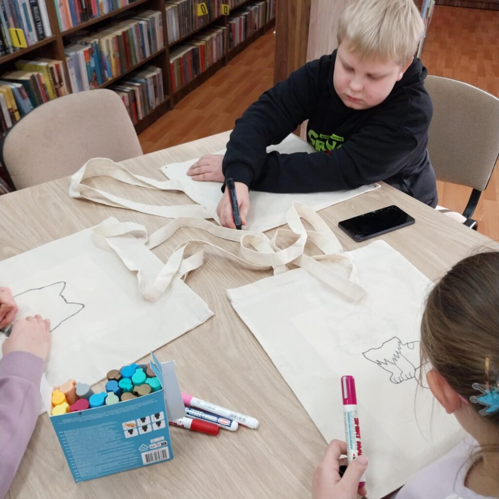 Po części literackiej przyszedł czas na twórczą zabawę. Dzieci wzięły udział w warsztatach plastycznych, podczas których malowały bawełniane torby ozdabiając je wybranymi przez siebie motywami kotów. Każda torba była inna — kolorowa, pomysłowa i odzwierciedlająca indywidualną kreatywność małych artystów. Zajęcia pozwoliły połączyć literaturę z działaniem artystycznym, co stworzyło atmosferę radości i swobodnej twórczości.