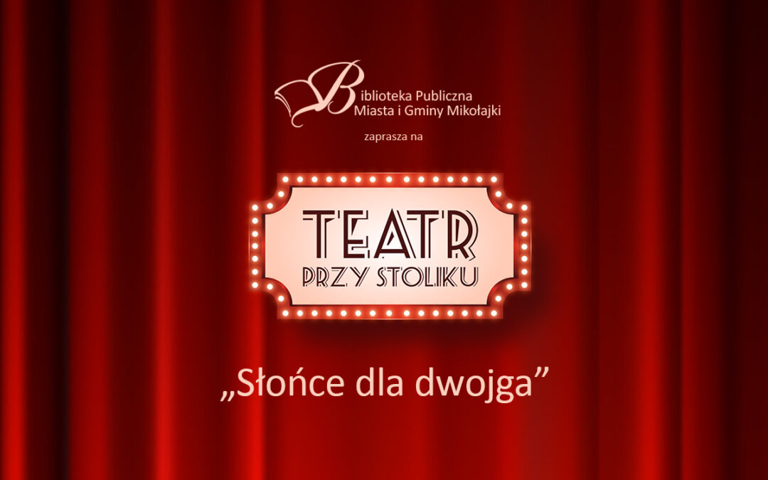 Serdecznie zapraszamy na „Teatr przy stoliku” do Klubu Czytelniczego ABC w Centrum Kultury „KŁOBUK”. Tym razem aktorzy Teatru im. Stefana Jaracza w Olsztynie – Katarzyna Kropidłowska i Marian Czarkowski – przeczytają dla nas sztukę pod tytułem „Słońce dla dwojga”.